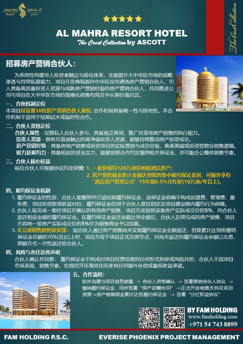 房屋房产 ALMAHRA度假酒店项目|招募房产营销合伙人:为系统性构建华人投资者触达与转化体系,全面提升市场的战略渗透与持续拓展能力,现面向中华区定向遴选房产营销合伙人,引入具备高净值投资人圈层,懂资产型房产投资逻辑的房产营销合伙人,共同推进公司与项目在大中华区市场的销售布局及中长期价值沉淀。本项目仅设置10位房产营销合伙人席位,合作机制具备唯一性与排他性,并以成交结果为导向的合作模式,并享有行业内最前卫合伙人奖励机制。名额有限,满额即止! 微信用户_621 2026-02-06 0 评论 0 喜欢